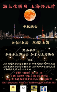 继成功举办成立五周年线上文艺晚会后,多伦多上海协会 将携手加拿大上海商会共同主办,上海交通大学多伦多校友会,复旦大学多伦多校友会,加拿大同济大学校友会,上海大学加拿大校友会 上海师范大学加拿大校友会 协办的,《海上生明月,上海共此时》大型综艺晚会,将于2022 年 9月 4 日 (星期日),晚上 7:30 在大多伦多中华文化中心何伯钊剧院举办。届时由来自中国上海的协会会员、艺术家和来自加拿大多伦多的各界人士,欢聚一堂,共渡中秋。